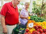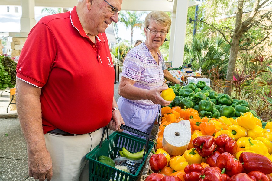 Jim and Ruth Dorsten comb through the fresh vegetables at the farmers market in the Pavilion in Port Orange. Photo by Zach Fedewa