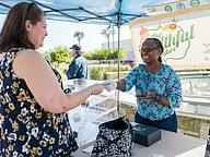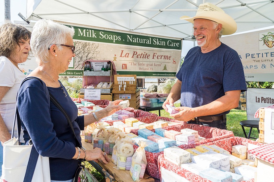 Carol Mugo serves Brenda Detweiler at the farmers market in the Pavilion in Port Orange. Photo by Zach Fedewa