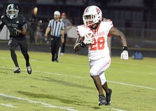Seabreeze wide receiver Landon Smith (8) makes a catch in the game against the Pine Ridge Panthers. Photo by Michele Meyers