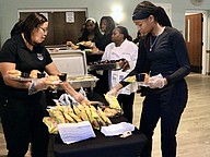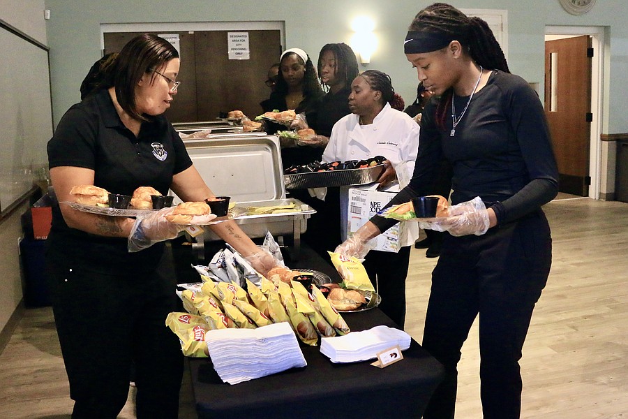 Students in the Matanzas and Flagler Palm Coast High Schools' African American Mentoring Program for Girls serve food at the Shirley Chisholm birthday luncheon. Photo by Sierra Williams