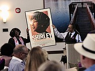 Shirley Chisholm's god-daughter Marie Bosley-Ford presents Agnes Lightfoot, president of the Democratic Women's Club of Flagler County, an official movie poster for "Shirley," a biographical Netflix movie that premiered in March. Photo by Sierra Williams