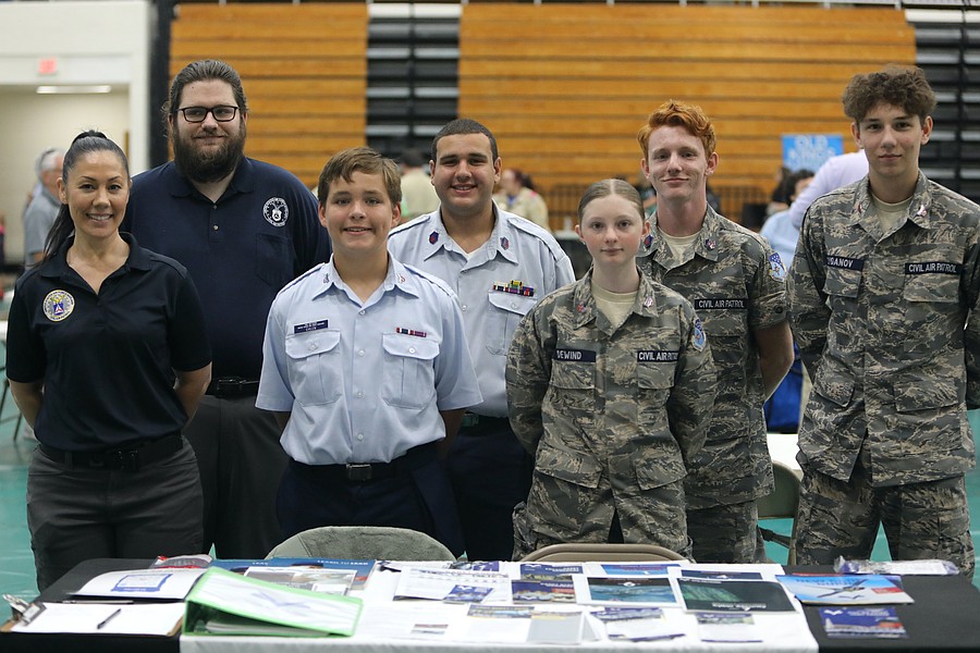 Civil Air Patrol Flagler Cadet Squadron. Commander Melinda Ainsworth, Deputy Commander Gavin Morton and cadets. The program focuses on aerospace instruction, leadership, character development and physical fitness. Photo by Brent Woronoff