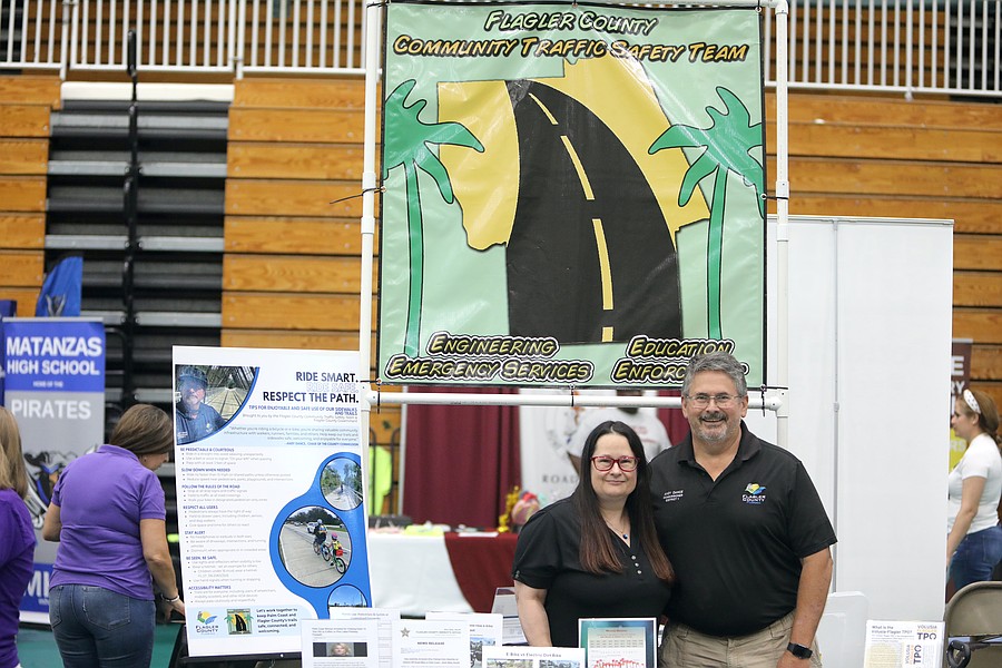 Pamela Blankenship, community outreach coordinator for the Volusia-Flagler Transportation Organization; and Flagler County Commission Chair Andy Dance, who is the Flagler County Community Traffic Safety Team chairman. They provided information on bicycle and e-bike safety on sidewalks and trails. Photo by Brent Woronoff