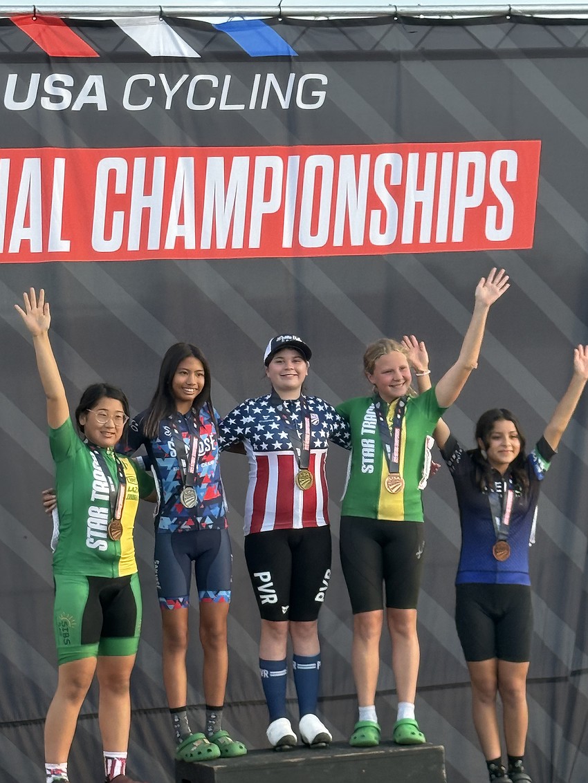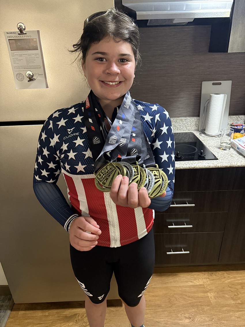 Kate won three gold medals, placing first in the 3-lap scratch race, the 500-meter time trial and the omnium multi-race point event for girls ages 11-12. She also won two silvers and three bronze medals.