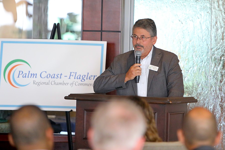 Flagler County Commission Chair Andy Dance provides an update of county projects at the Palm Coast-Flagler Regional Chamber of Commerce Legislative Update Breakfast on Aug. 7 at the Hammock Dunes Club. Photo by Brent Woronoff