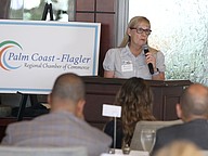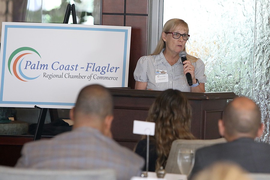 Palm Coast Vice Mayor Theresa Pontieri gives a city update at the Palm Coast-Flagler Regional Chamber of Commerce Legislative Update Breakfast on Aug. 7 at the Hammock Dunes Club. Photo by Brent Woronoff