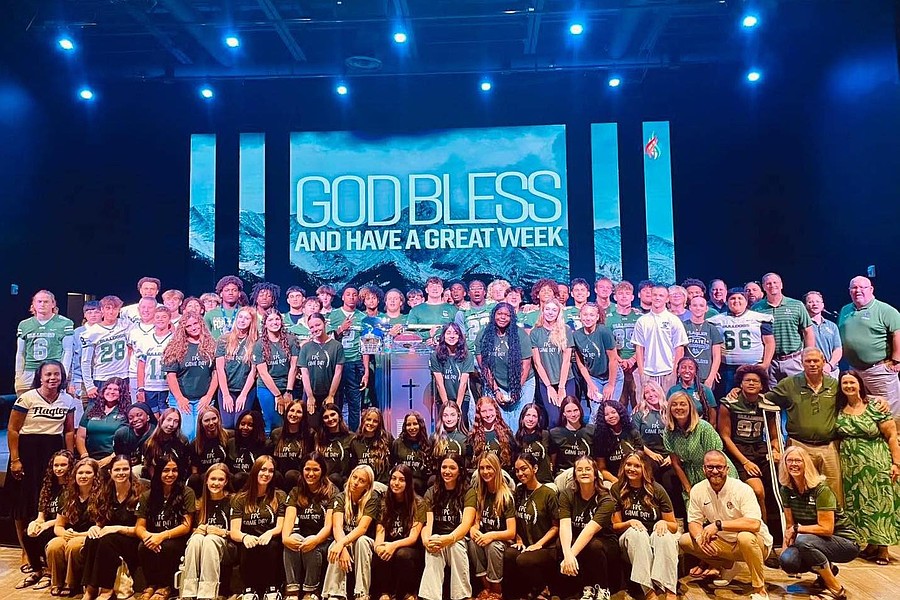 Matanzas and FPC players, coaches, students, administrators and Flagler County School Board members pose for a group photo after the Football Sunday service at Palm Coast United Methodist Church. Photo by Brent Woronoff