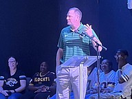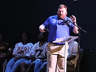 Matanzas football coach Matt Forrest reads the Daily Message at Palm Coast United Methodist Church's Football Sunday service on Aug. 10. Photo by Brent Woronoff