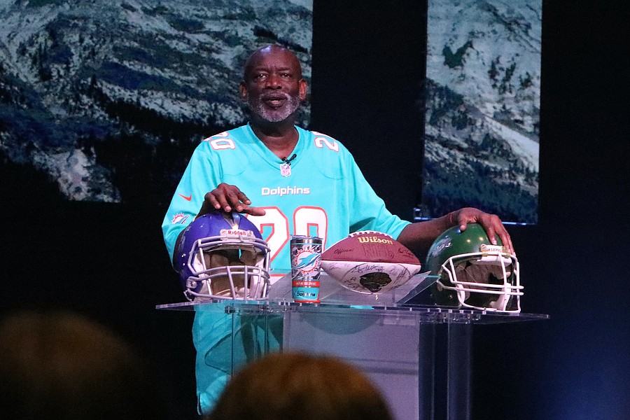 Pastor Kevin James wore his Miami Dolphins jersey, and many congregants wore jerseys of their own favorite football teams. Flagler Schools Superintendent LaShakia Moore wore a custom-made jersey with Flagler printed on the front and logos for the Matanzas Pirates and Flagler Palm Coast Bulldogs on each shoulder.