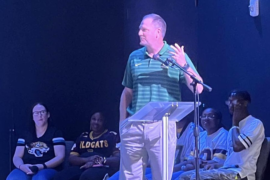 Moore and head football coaches Matt Forrest of Matanzas and Patrick Turner of FPC spoke. School Board member Derek Barrs delivered a prayer for the students, the teachers and the community with students returning to school the following day. And a player from each team — Ehimen “Heman” Adjede of FPC and Javonte Patton of Matanzas — recited a scripture reading.