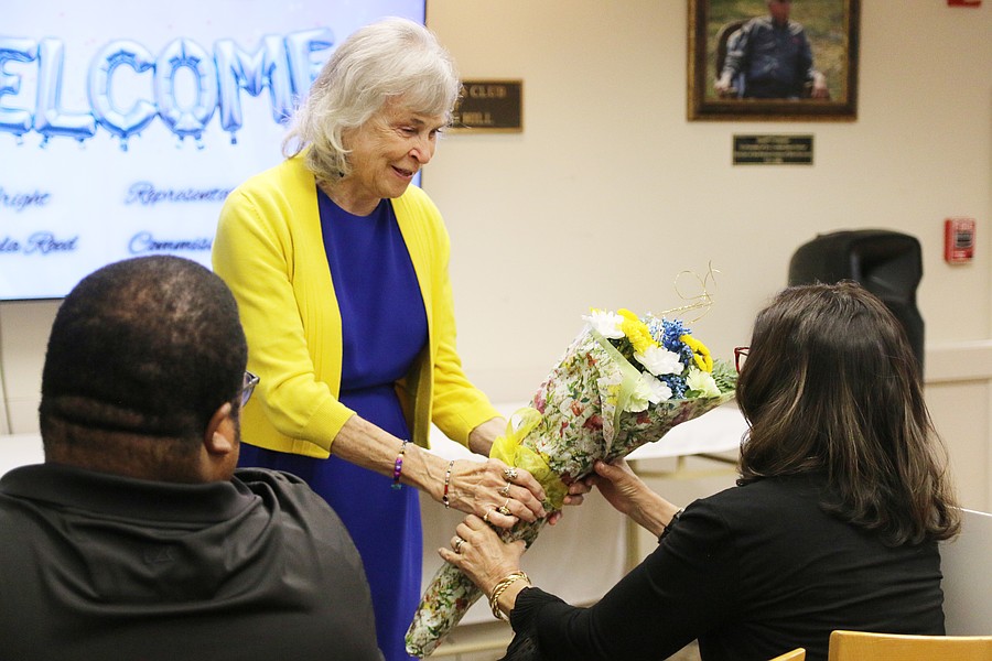 Conklin Davis Center Board Chair Nancy Epps presents President and CEO Ronee David with flowers. Photo by Jarleene Almenas
