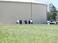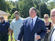 Randy Fine, city officials and media walk past a tank at Palm Coast's Wastewater Treatment Plant 1. Photo by Brent Woronoff