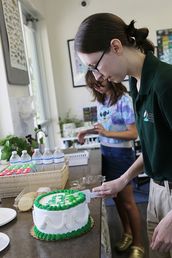 Ellie Schultz, city recreation leader at the EDC, cuts the cake. Photo by Jarleene Almenas