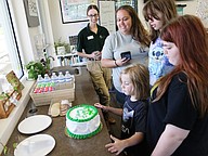 Ellie Schultz, city recreation leader at the EDC, and residents Rachel and Makayla Sanford, and Aiden and Emily Queen get ready to eat cake. Photo by Jarleene Almenas