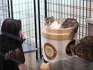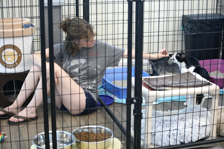 Entertaining a cat during the adoption event. Photo by Brent Woronoff