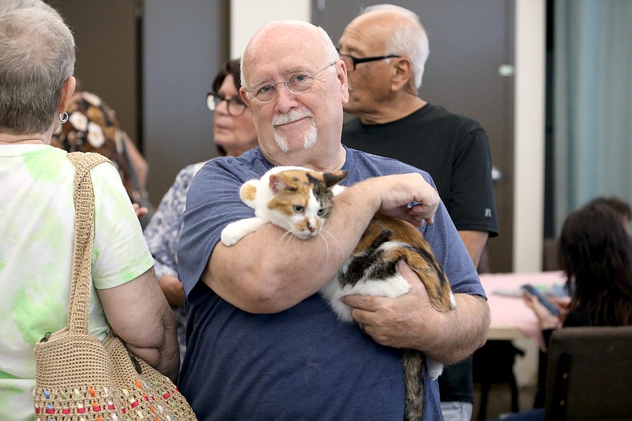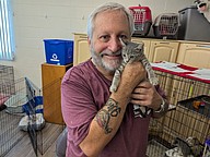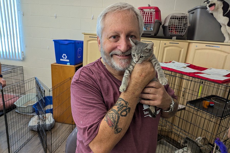 Dave Foreman holds his new cat. Foreman's wife, Shelley, had to talk him into adopting a cat, because they have four at home, plus two dogs. Photo by Brent Woronoff