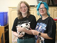 Flagler Palm Coast High student Holly Kittrell holds Shari while Daytona State College student Grace Ivey gives her a treat. They came to the adoption event to see the cats, but not to adopt any. "I probably can't," Kittrell said. "We both have cats of our own," said Ivey. Photo by Brent Woronoff