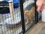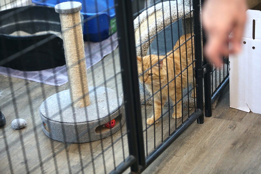 An orange tabby cat patrols the large cage area at the adoption event. Photo by Brent Woronoff