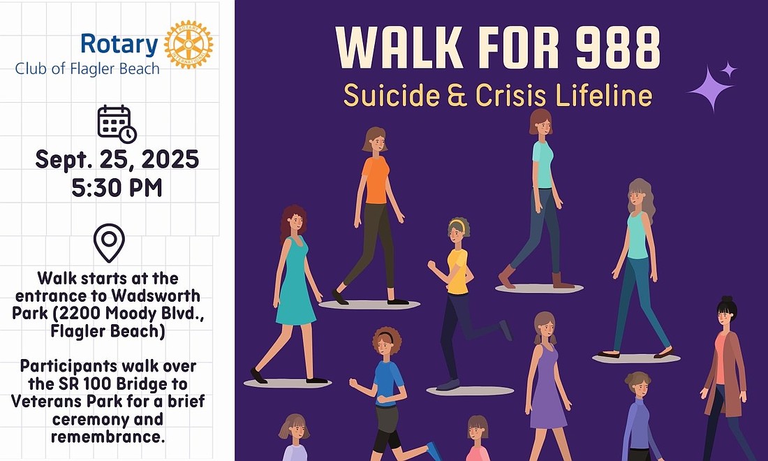 The Rotary Club of Flagler Beach will host an Awareness Walk on Thursday, Sept. 25, to promote the 988 National Suicide & Crisis Lifeline.