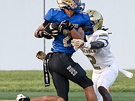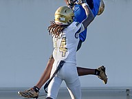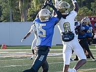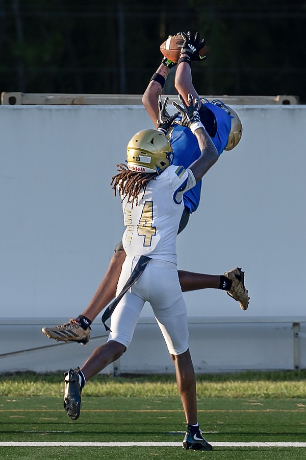 Mainland wide receiver Marcus Day (left) snags his first interception of the game as Kowboy Jakyri Watson attempts to stop his momentum in their pre-season game on Friday, Aug. 15 at the Daytona Stadium. Photo by Michele Meyers