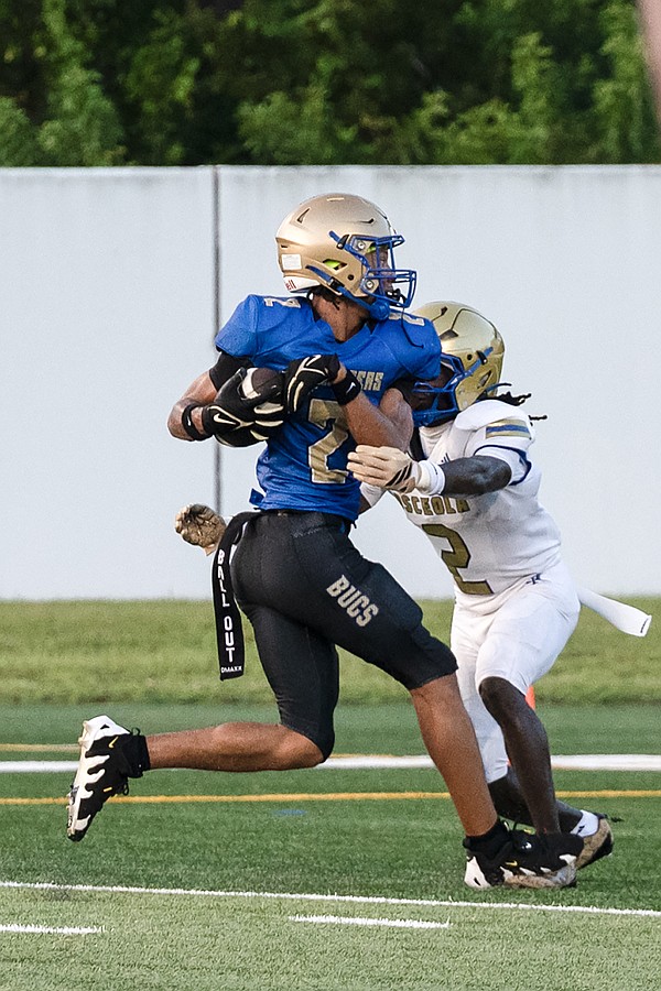 Mainland wide receiver Chris Butler (left) catches the pass while underpressure by Osceola defensive back Jabari Lofton (14) in the kickoff classic on Friday, Aug. 15 at the Daytona Stadium. Photo by Michele Meyers