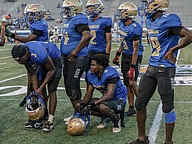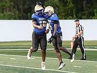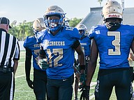 Mainland players Cortez Waring (18) and Kiarin Sullivan (8) celebrate teammate Marcus Day's interception in the pre-season game against the Osceola Kowboys on Friday, Aug. 15 at the Daytona Stadium. Photo by Michele Meyers