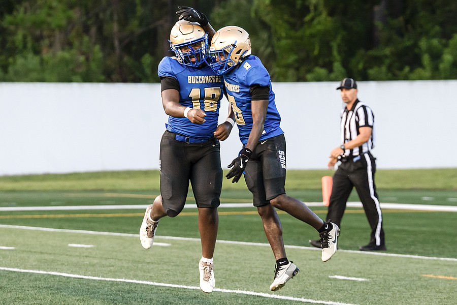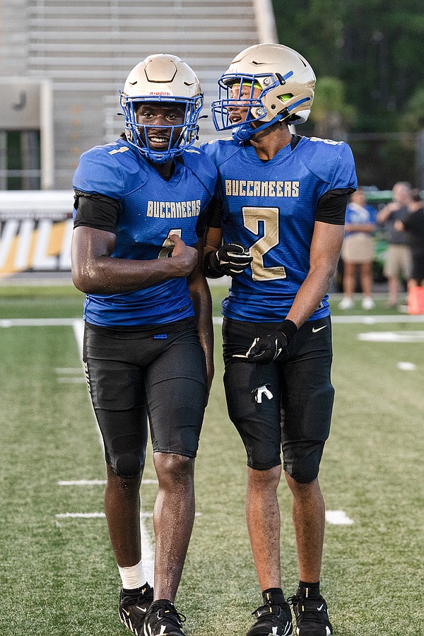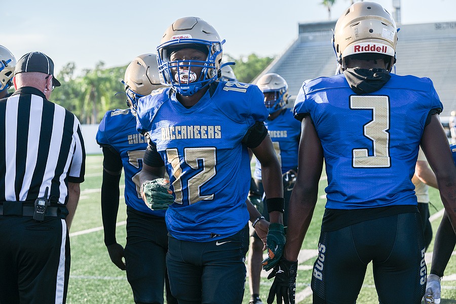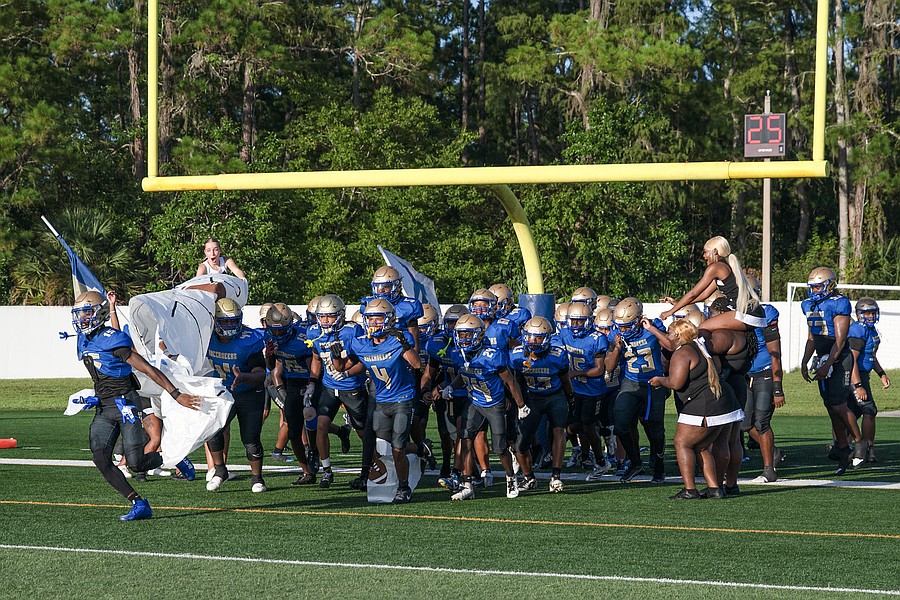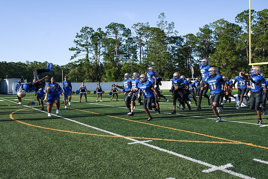 Kadin Pierce-Flores (left) leads the Bucs onto the field before the pre-season game against the Osceola Kowboys on Friday, Aug. 15 at the Datyona Stadium. Photo by Michele Meyers