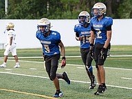 Mainland players Denzel Shropshire (9), Bubba Westbrook (19) and Marcus Day celebrate Day's interception in the pre-season game against the Osceola Kowboys on Friday, Aug. 15 at the Daytona Stadium. Photo by Michele Meyers