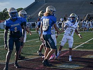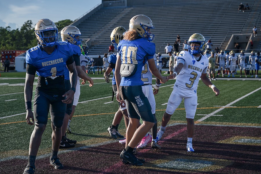 Mainland team captains Dennis "Tank" King III (1) and Sebastian Johnson (10) shake hands with Osceola captain Alijah Jenkins (3) before the pre-season game on Friday, Aug. 15 at the Daytona Stadium. Photo by Michele Meyers