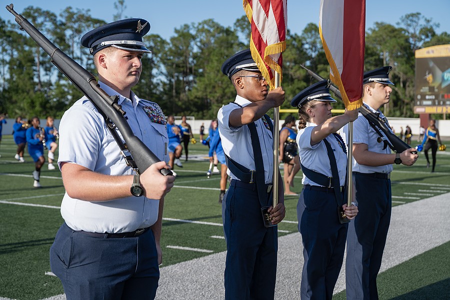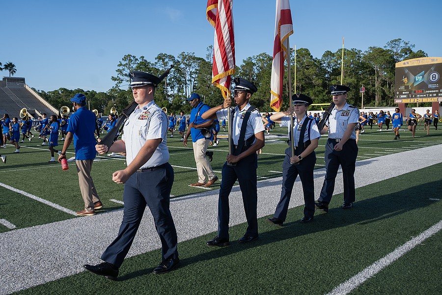 Mainland's Air Force JROTC color guard take the field with the Lady Bucs Dance and Drill Team, majorettes and band before the pre-season game against the Osceola Kowboys on Friday, Aug. 15. Photo by Michele Meyers