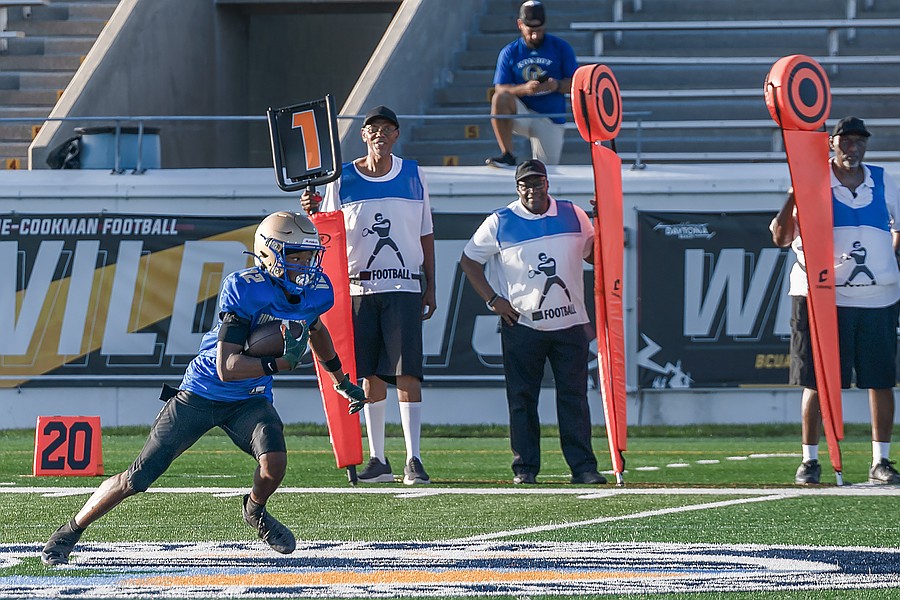 Mainland receiver Theo Bryant runs the ball for a 16-yard kickoff return at the start of the game against the Osceola Kowboys on Friday, Aug. 15 at the Daytona Stadium. Photo by Michele Meyers