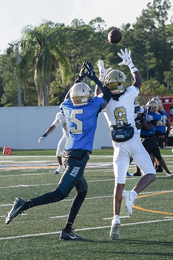 Mainland wide receiver Melo Parks (5) competes with Osceola's Jamario Bradford (8) for the pass during the pre-season game on Friday, Aug. 15 at the Daytona Stadium. Photo by Michele Meyers