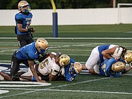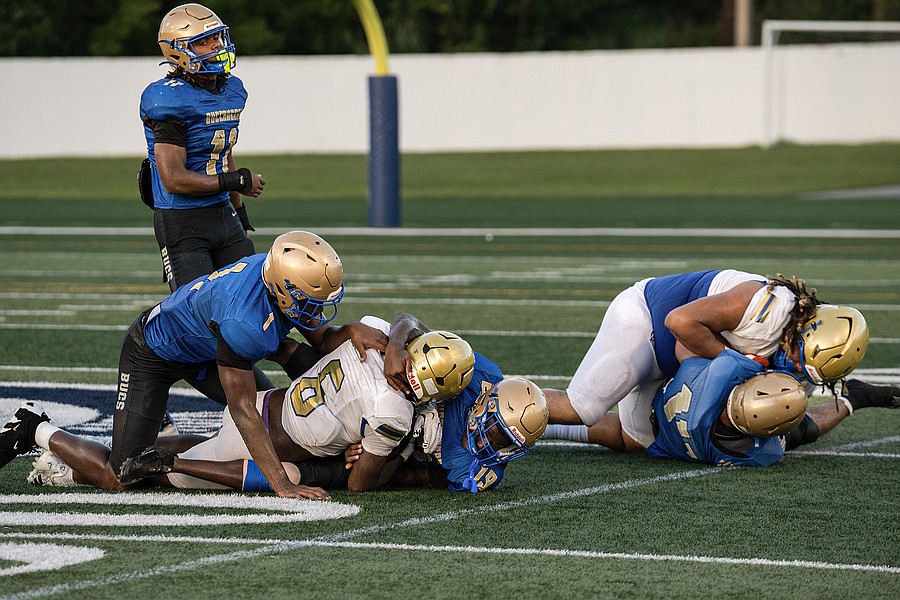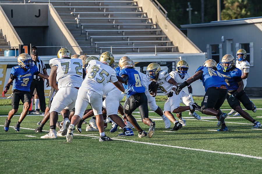 The Mainland defense is all action during the game against the Osceola Kowboys on Friday, Aug. 15 at the Daytona Stadium. Photo by Michele Meyers