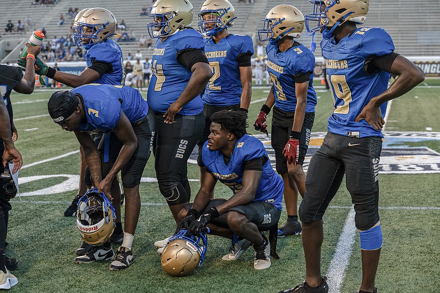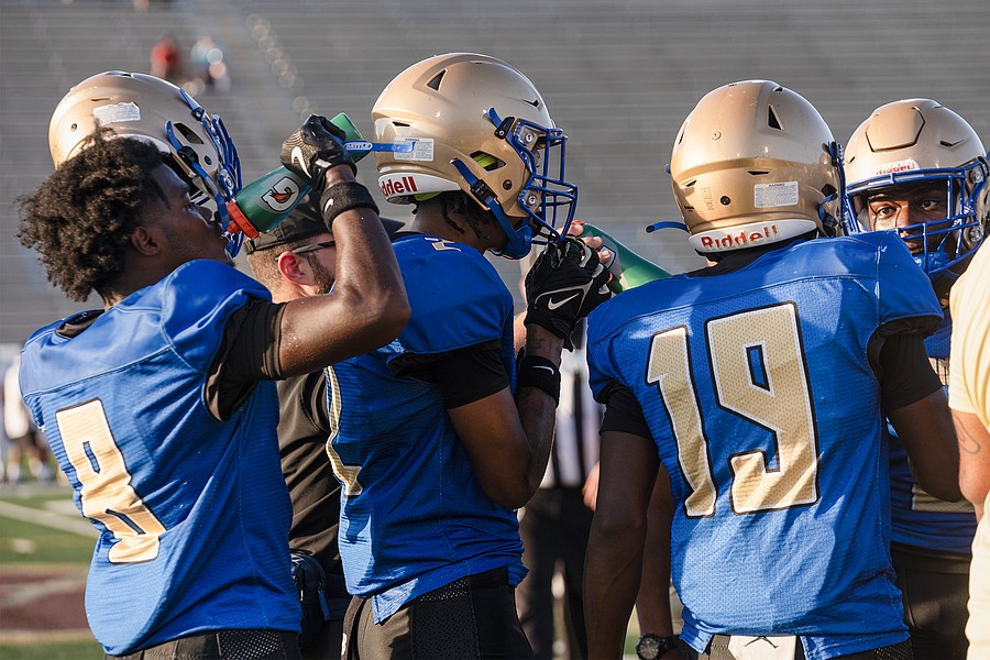Water break for the Bucs during the kickoff classic against the Osceola Kowboys on Friday, Aug. 15 at the Daytona Stadium. Photo by Michele Meyers