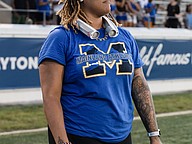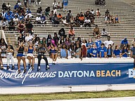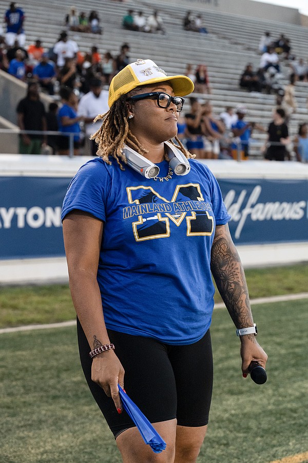 Mainland cheer coach Jenece Giddens emceed during the halftime show at the kickoff classic against Osceola on Friday, Aug. 15 at the Daytona Stadium. Photo by Michele Meyers