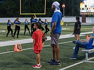 Kadin Pierce-Flores does a back flip as he leads the Bucs onto the field before the pre-season game against the Osceola Kowboys on Friday, Aug. 15 at the Datyona Stadium. Photo by Michele Meyers