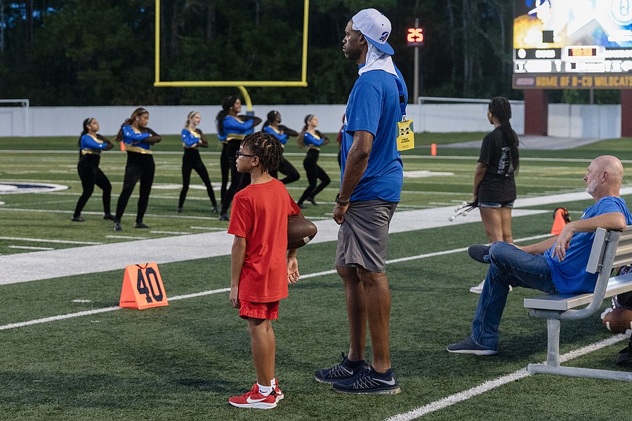 Mainland alumnus Vince Carter and his son Vince Carter Jr. watch the halftime show during the kickoff classic against the Osceola Kowboys on Friday, Aug. 15 at the Daytona Stadium. Photo by Michele Meyers