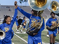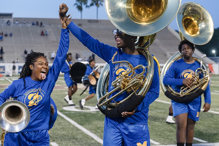 Mainland brass celebrates after their halftime show at the kickoff classic against Osceola on Friday, Aug. 15 at the Daytona Stadium. Photo by Michele Meyers