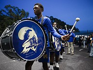 Mainland's drumline continued after the haltime show at the kickoff classic against Osceola on Friday, Aug. 15 at the Daytona Stadium. Photo by Michele Meyers