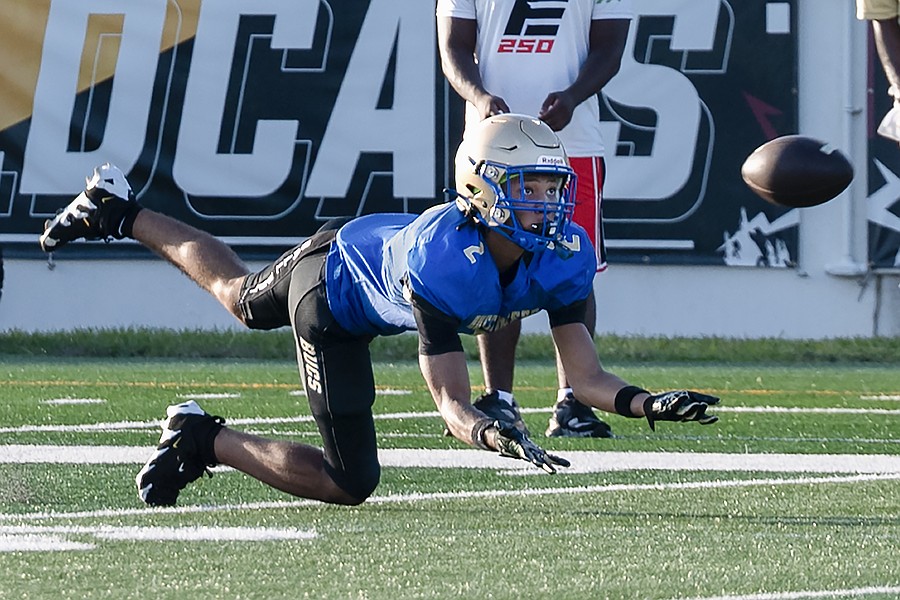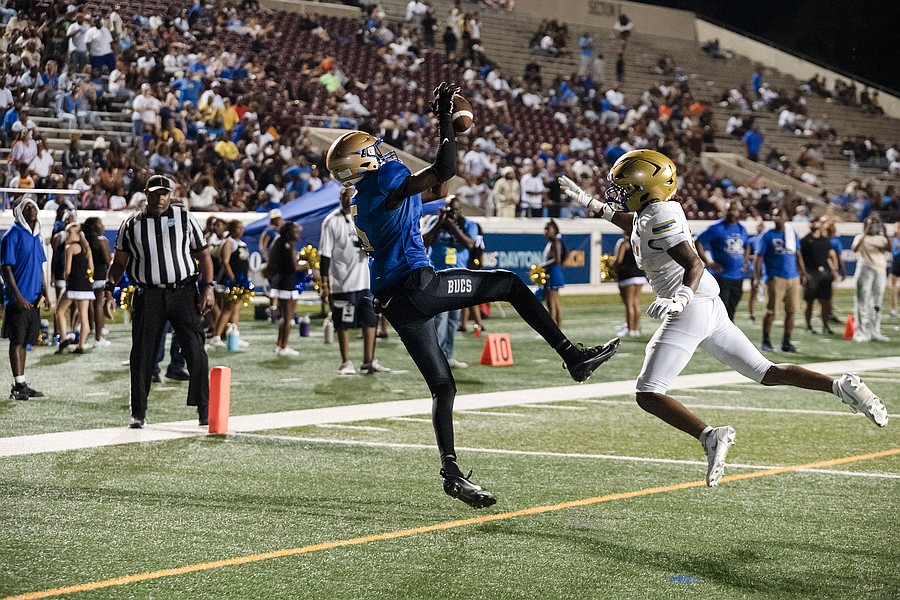 Mainland wide receiver Jaden "Melo" Parks catches the two-point conversion in the end zone pushing the score to 14-13 over the Osceola Kowboys on Friday, Aug. 15 at the Daytona Stadium. Photo by Michele Meyers