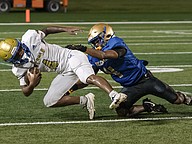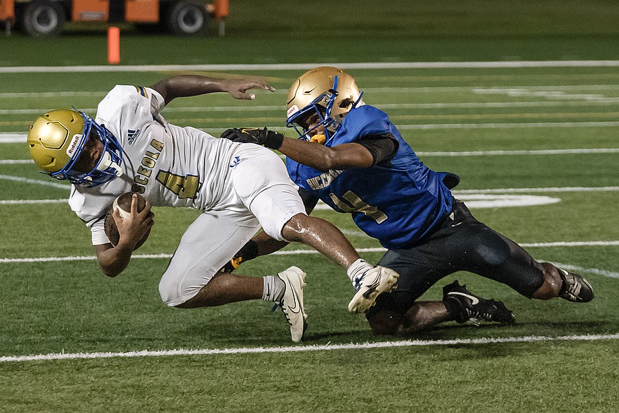 Mainland wide receiver Christian Cooper (right) stops Kowboy Nathaniel Barnett (4) in the pre-season game on Friday, Aug. 15 at the Daytona Stadium. Photo by Michele Meyers