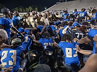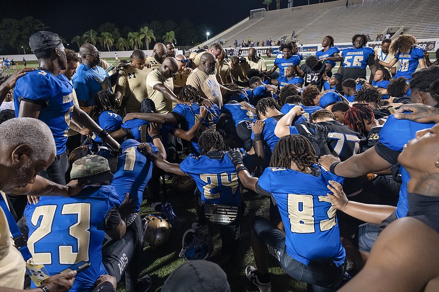 The Mainland Buccaneers bow their heads in prayer after their 14-13 kickoff classic win against the Osceola Kowboys on Friday, Aug. 15 at the Daytona Stadium. Photo by Michele Meyers
