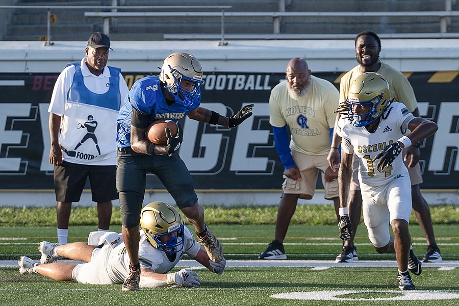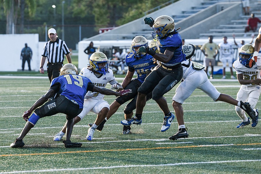 Wide receiver Chris Butler (7) escapes a tackle by Osceola linebacker Colton Carter then faces defensive back Jabari Lofton (14) in the kickoff classic on Friday, Aug. 15 at the Daytona Stadium. Photo by Michele Meyers
