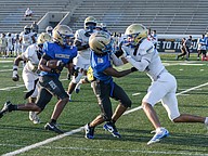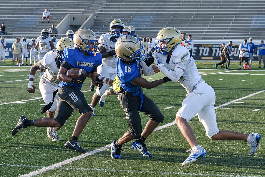 The Mainland defense battles against Osceola during the kickoff classic on Friday, Aug. 15 at the Daytona Stadium. Photo by Michele Meyers