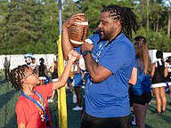 Vince Carter Jr. (left) plays around with Mainland basketball coach Joe Giddens (right) at the kickoff classic on Friday, Aug. 15 at the Daytona Stadium. Photo by Michele Meyers
