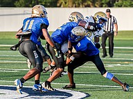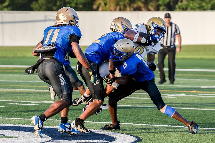Mainland defensive back Bubba Westbrook (right) tackles Osceola's Jaxson Hardnett with the help of Marcus Day (second from left) and Shawn Holmes (11) their pre-season game on Friday, Aug. 15 at the Daytona Stadium. Photo by Michele Meyers