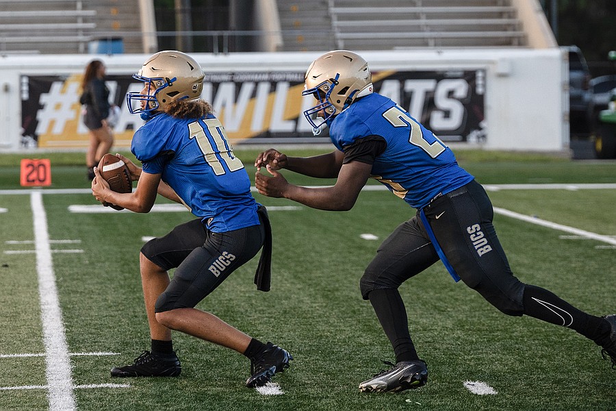 Mainland quarterback Sebastian Johnson (10) fakes the handoff to running back Joshua Dudley (left) in the kickoff classic against Osceola on Friday, Aug. 15 at the Daytona Stadium. Photo by Michele Meyers