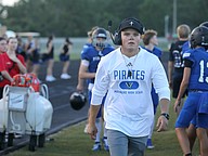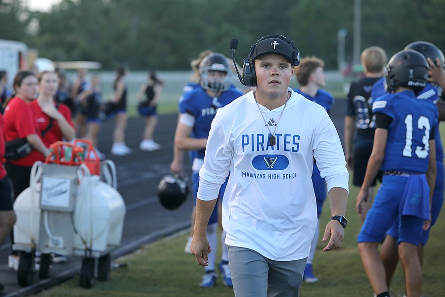 Matanzas quarterback coach Bryce Petellat walks the sideline during the Pirates' kickoff classic against Episcopal. Photo by Brent Woronoff