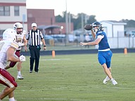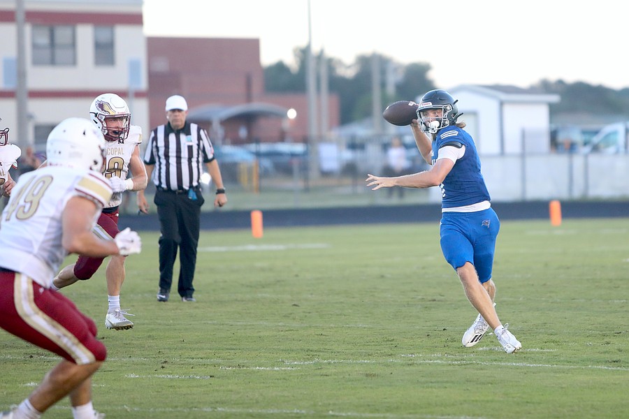 Matanzas quarterback Cole Walker looks to pass against Episcopal in the kickoff classic on Aug. 15. Photo by Brent Woronoff