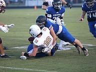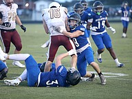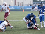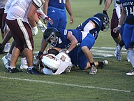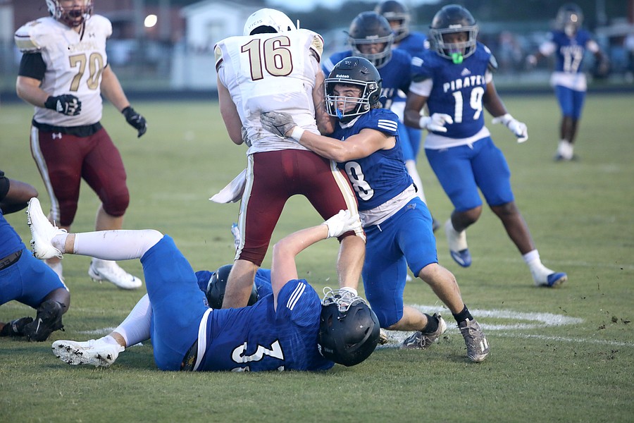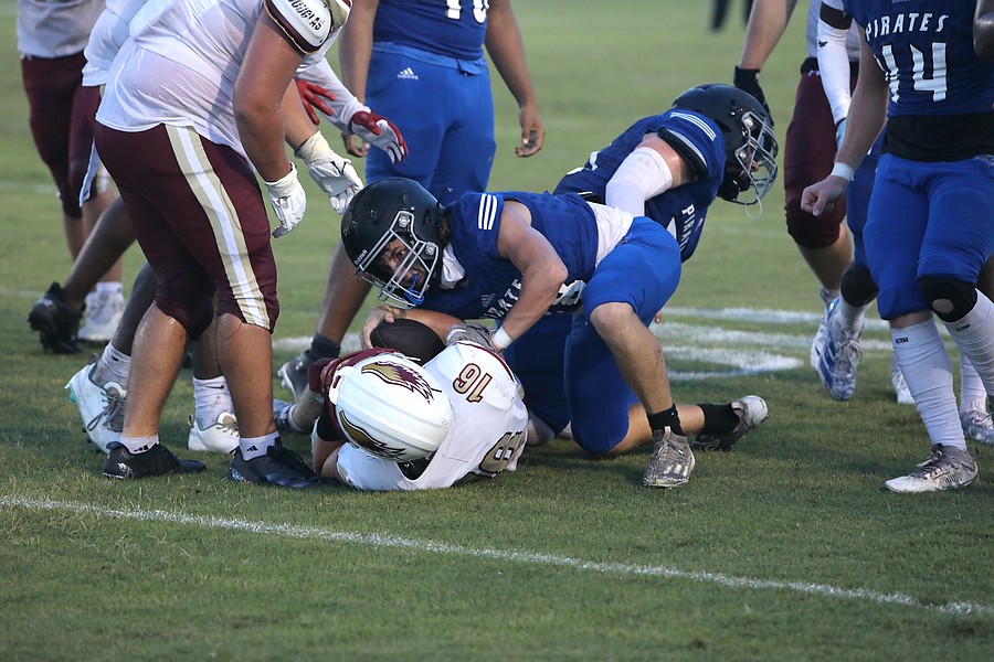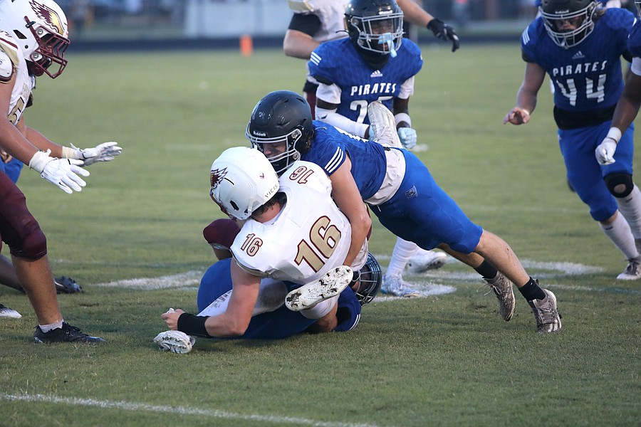 Matanzas linebacker Nick Yacano (18) sacks Episcopal quarterback Harrison Spencer (16) as Pirate teammates assist in the Aug. 15 kickoff classic. Photo by Brent Woronoff